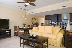 British West Indies inspired furnishings grace the living room and dining area which open via pocketing sliding glass doors--expanding the living space to a large oceanfront terrace with stunning Grace Bay views, Caribbean breezes and lovely wicker furniture. This spacious suite features a master bedroom with a luxurious pillow-top king bed, upholstered chair and ottoman, large walk-in closet, and a desk from which guests may enjoy turquoise water views beyond the private, oceanfront terrace with sitting area. A richly finished in-suite full marble bath with a walk-in shower and double vanity complement the master suite.